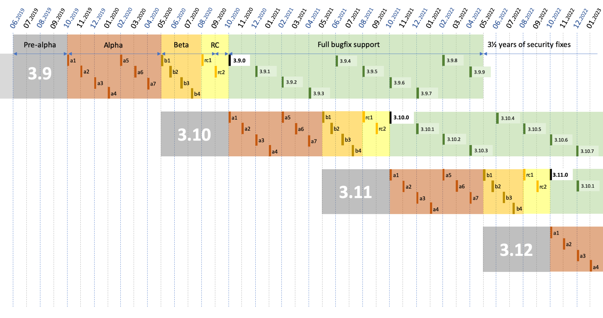 - The first five months overlap with Python 3.(X-1).0’s beta and release candidate stages and are thus unversioned.